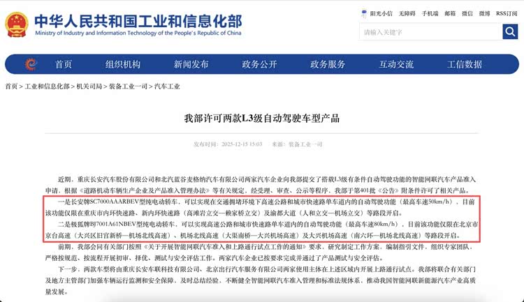 目前热度已过,咱们就冷静的分析分析。工信部此次的发文被众多网友认为是自动驾驶的“通关文牒”,实则不然,仅是给自动驾驶发了张L3的实习证而已。毕竟,官方通告关键细节写得很清楚:许可两款汽车在指定区域内可以限速50km/h和80km/h使用L3有条件自动驾驶。看准了,L3是有条件自动驾驶,长安车型仅限重庆特定路段、极狐车型也限定北京部分高速,同时均未开放自动变道功能,说白了就是“试点版L3”。