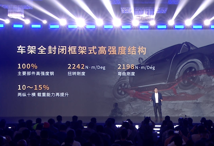 采用车架全封闭框架式高强度结构,主要部件高强度钢100%,扭转刚度2242Nm/deg,弯曲刚度2198Nm/deg,两纵十横承重能力再提升10-15%。