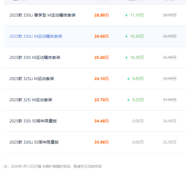 车家号·0浏览·2026-01-13 20:45 · 广东2026开年豪华车市硝烟四起, 宝马3系(参数|询价)率先抛出重磅福利,最高优惠达11.19万,部分车型优惠后裸车价下探至20.31万区间,让无数消费者惊呼“蓝天白云梦触手可及”。这波降价潮中,曾经落地近40万的330Li M运动曜夜版,如今23万级即可拿下,性价比直接拉满。