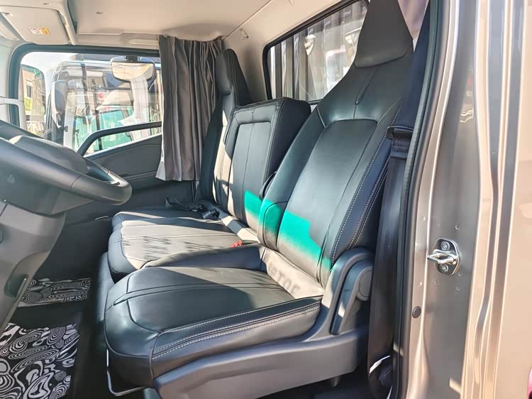 主副驾座椅中间没有任何部件,其实已经可以躺平休息,但是远程怕用户躺的不够舒服,通过放倒副驾椅背,加上折叠垫子,就形成了一张平坦的单人床。再结合全车窗帘,可以踏踏实实睡大觉。外来还会有高顶驾驶室,配有上卧铺,想怎么躺就怎么躺。