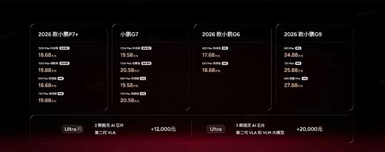 如果要用上小鹏深度应用AI技术的最新一代智能座舱,2026款小鹏P7+和小鹏G7都需要额外支付2万元升级到小鹏自研的智能座舱图灵AI芯片。