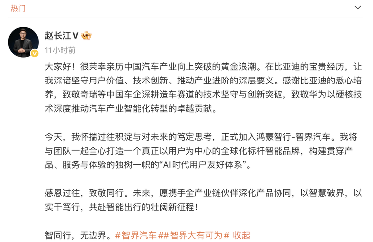 “今天,我怀揣过往积淀与对未来的笃定思考,正式加入鸿蒙智行-智界汽车。”1月13日,原腾势销售事业部总经理赵长江在个人微博发文,宣布出任智界汽车执行董事及执行副总裁。