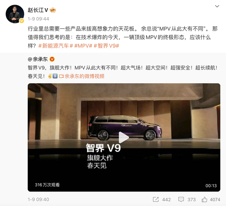 就在前不久,当华为余承东发布 智界V9(参数|询价)即将亮相的消息时,赵长江进行了转发并评论:“行业里总需要一些产品来拔高想象力的天花板。”当网友追问他对这款车的评价时,他更是直言:“保守估计三年内没有对手!”