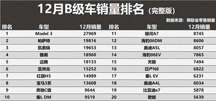 根据最新公布的销量数据来看,12月份B级车市场格局比较清晰,纯电车再次遭遇了大败,仅有2款车型入榜前十,而传统燃油车则是持续爆发, 凯美瑞(参数|询价)获得了季军,雅阁、迈腾、亚洲龙以及红旗H5也都是表现不错。具体方面,特斯拉Model 3以近2.8万辆的成绩领跑,传统燃油阵营的根基依然深厚,帕萨特、凯美瑞、雅阁、迈腾这“四大金刚”紧随其后,月销量均稳定在1.8万辆以上。亚洲龙、红旗H5、宝马3系和奔驰C级也稳稳占据前十席位,共同构成了B级车市场的中坚力量。整体来看,B级车市场正在从燃油车主导的稳定格局,快速转向一个燃油与电动并存、竞争维度更加多元的新阶段。得B级车者得天下!12月销量:纯电车大败,凯美瑞季军,天籁第15!