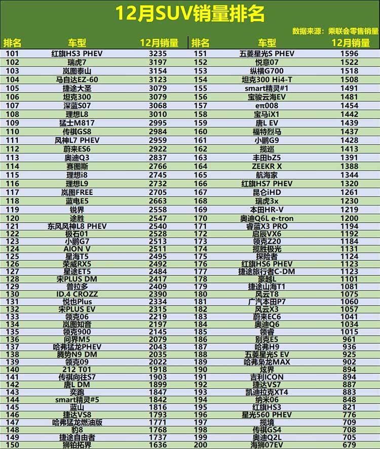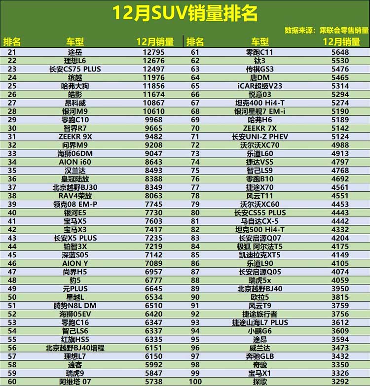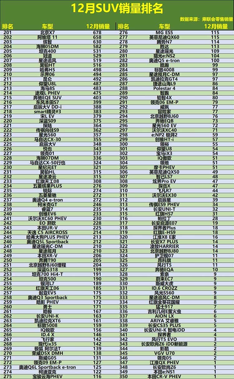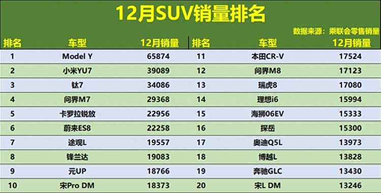 2025年12月,SUV市场以一场激烈的“收官战”为全年画上句号,整体格局在年底冲量的氛围下进一步固化,并呈现出更深刻的分化。特斯拉Model Y以超过6.5万辆的销量强势登顶,将领先优势扩大到了新的量级。小米YU7作为年度黑马,延续火爆势头,月销稳定在3.9万辆高位,稳居亚军。值得注意的是,销量前十名中,新能源车型占据了主导,从钛7、问界M7、宋Pro DM到元UP,构成了市场增长的核心引擎。传统燃油劲旅如丰田卡罗拉锐放、大众途观L虽仍位居前十,但销量与头部新能源车型已有明显差距。深入榜单中后段,月销过万的车型数量可观,但超过两百款车型月销量已不足5000辆,市场的“头部聚焦”与“长尾挣扎”现象在年底尤为凸显。