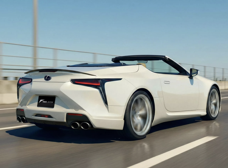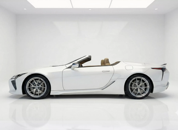 来到车身侧面,雷克萨斯LCTom's Edition是最让人心动的地方。修车的车身配备了可折叠的硬顶敞篷/软顶敞篷,与白色的车漆形成了鲜明的撞色对比。两个无边框车门搭配着两侧隐藏式门把手,让车身变得更加优雅、流畅。配备21英寸的锻造Y字形轮圈,匹配了米其林的245/40 R21(前轮)、275/35 R21(后轮),强调抓地力和高速稳定性。匹配了338mm的碳陶瓷复合刹车盘、308mm的碳陶瓷复合刹车盘,并进行了低趴处理。尺寸方面,这台雷克萨斯LC Tom's Edition长宽高分别为4770*1920*1345mm,车身轴距2870mm,该车采用双门两座的轿跑设计。
