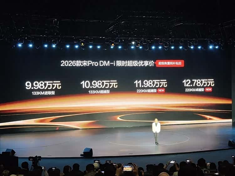 【车媒体丨新车】2026年1月10日,深圳比亚迪总部,2026款宋Pro DM-i 220km长续航版正式上市,炸响了2026年的行业惊雷,当屏幕显示出“限时优享价9.98万元起”时,现场爆发出持续掌声。CLTC纯电续航提升至220公里,这个数字不仅刷新了长续航插混SUV的价格纪录,更意味着比亚迪开启了10万以内家用SUV的长续航平权时代。