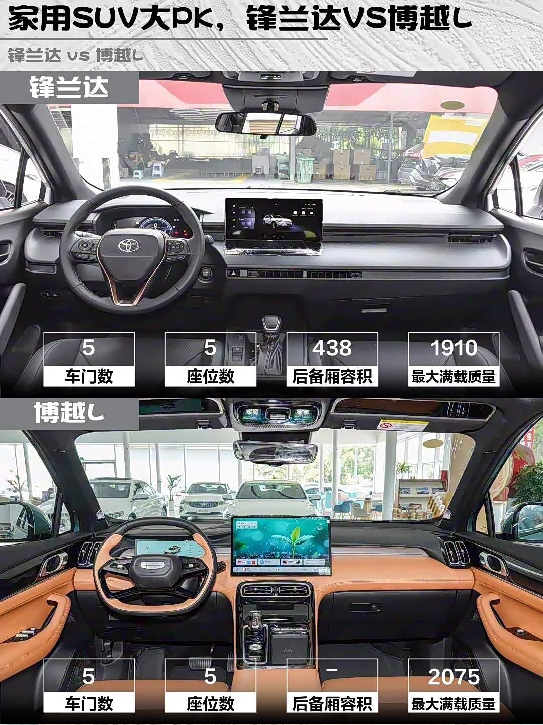 锋兰达标配L2辅助驾驶+全速自适应巡航,跑高速能自动跟车,但10.25英寸中控屏在博越L的15.4英寸巨屏面前像个小弟弟。博越L还多出360全景影像、电动尾门、全景天窗,语音控制能开空调/天窗/导航。不过丰田的机械挡把换挡比电子挡把更有驾驶参与感,这就看你要"极简生活"还是"智能家居"了~📱