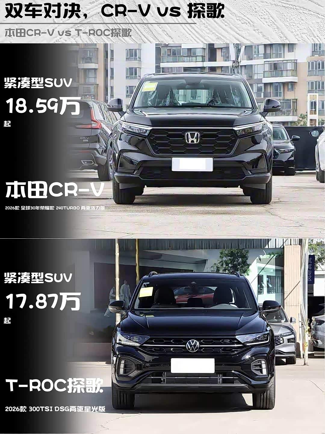 最近后台好多兄弟问我,18万预算买SUV到底选 本田CR-V(参数|询价)还是大众探歌?🤔 刚好上周去4S店把2026款CR-V 240TURBO两驱活力版和探歌300TSI DSG两驱星光版都试了,这就来波硬核对比!🔥
