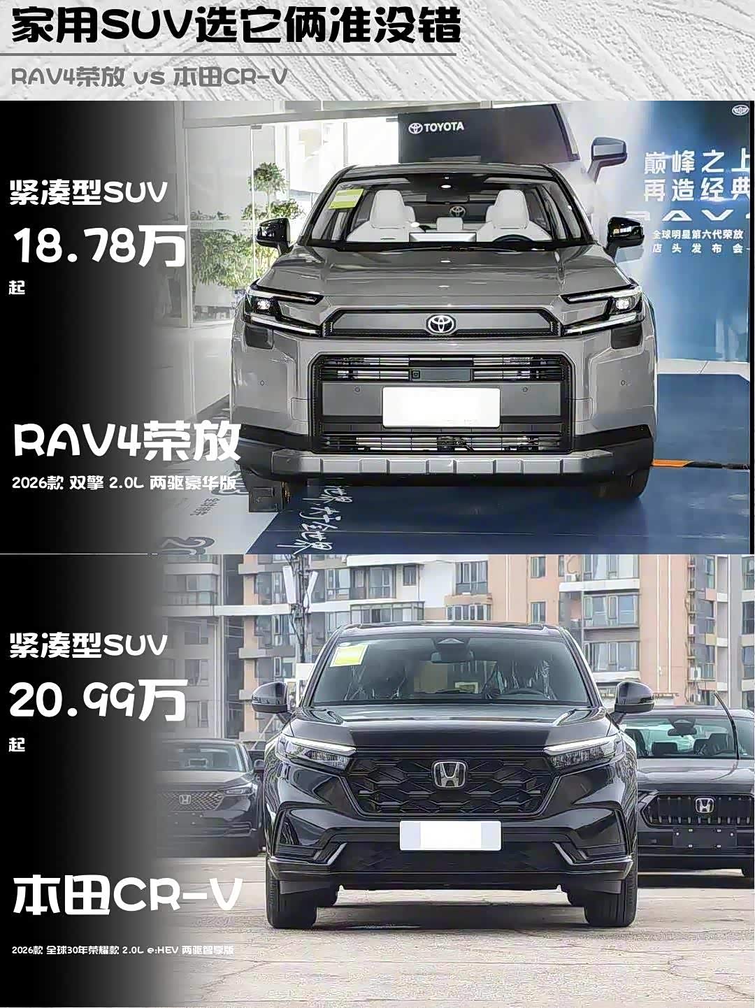 最近后台好多兄弟在问 RAV4荣放(参数|询价)和CR-V怎么选?刚好试驾了2026款RAV4荣放双擎2.0L两驱豪华版(18.78万)和CR-V 2026款2.0L e:HEV两驱智享版(20.99万),直接上干货对比👇