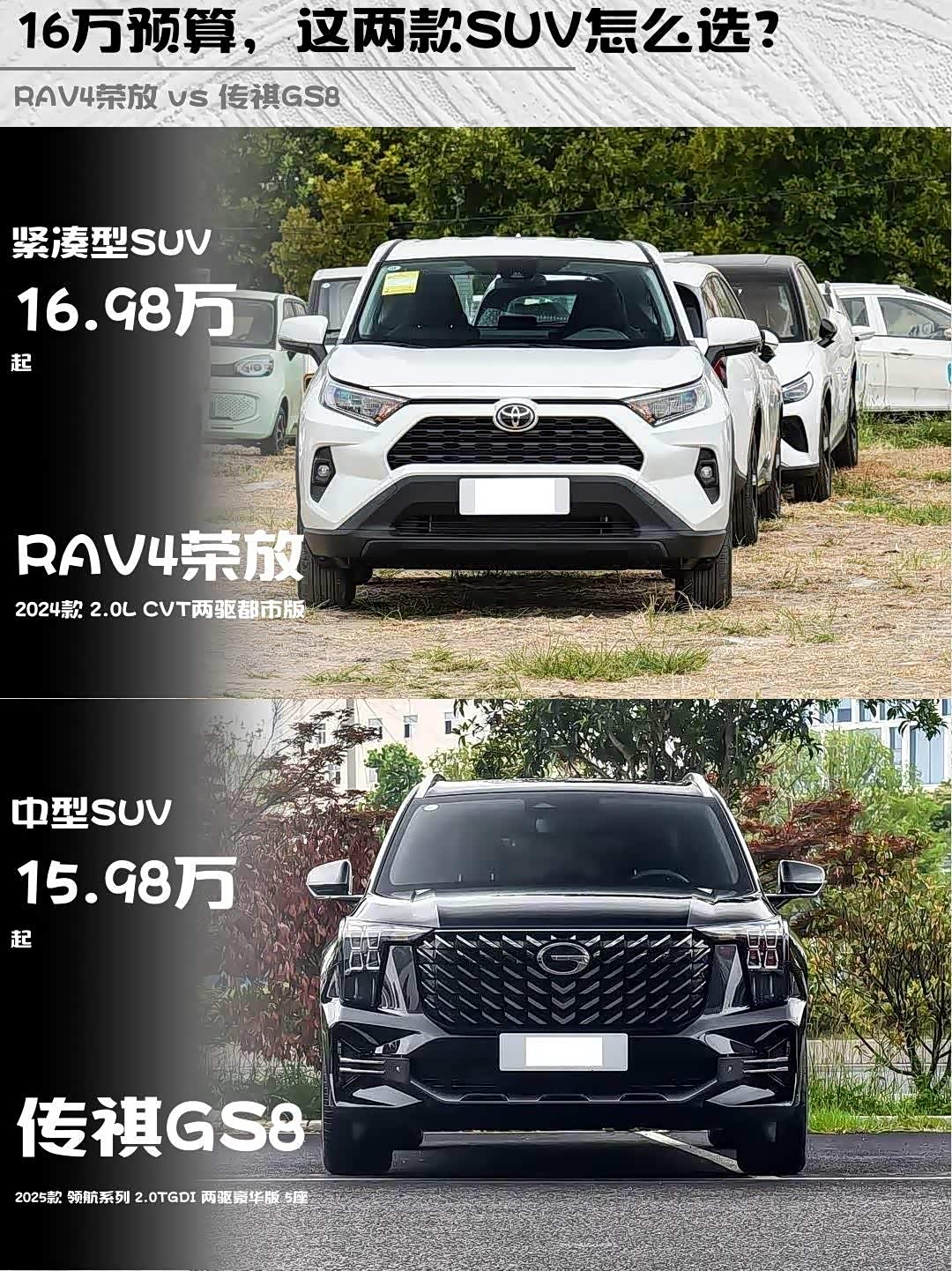 RAV4荣放2024款 2.0L都市版16.98万 vs 传祺GS8 2025款2.0T豪华版15.98万,差价1万但定位不同——前者是紧凑型,后者可是实打实的中型SUV!