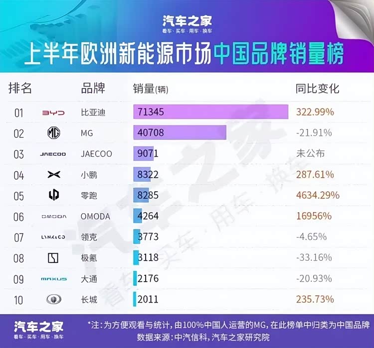 以一组数据为例,2022年,中国品牌在欧洲市场一共卖了5.8万辆电动汽车,同比飙升了128%,占到了欧洲电动汽车总销量的2%以上。要知道2019年,这一占比仅为0.4%。