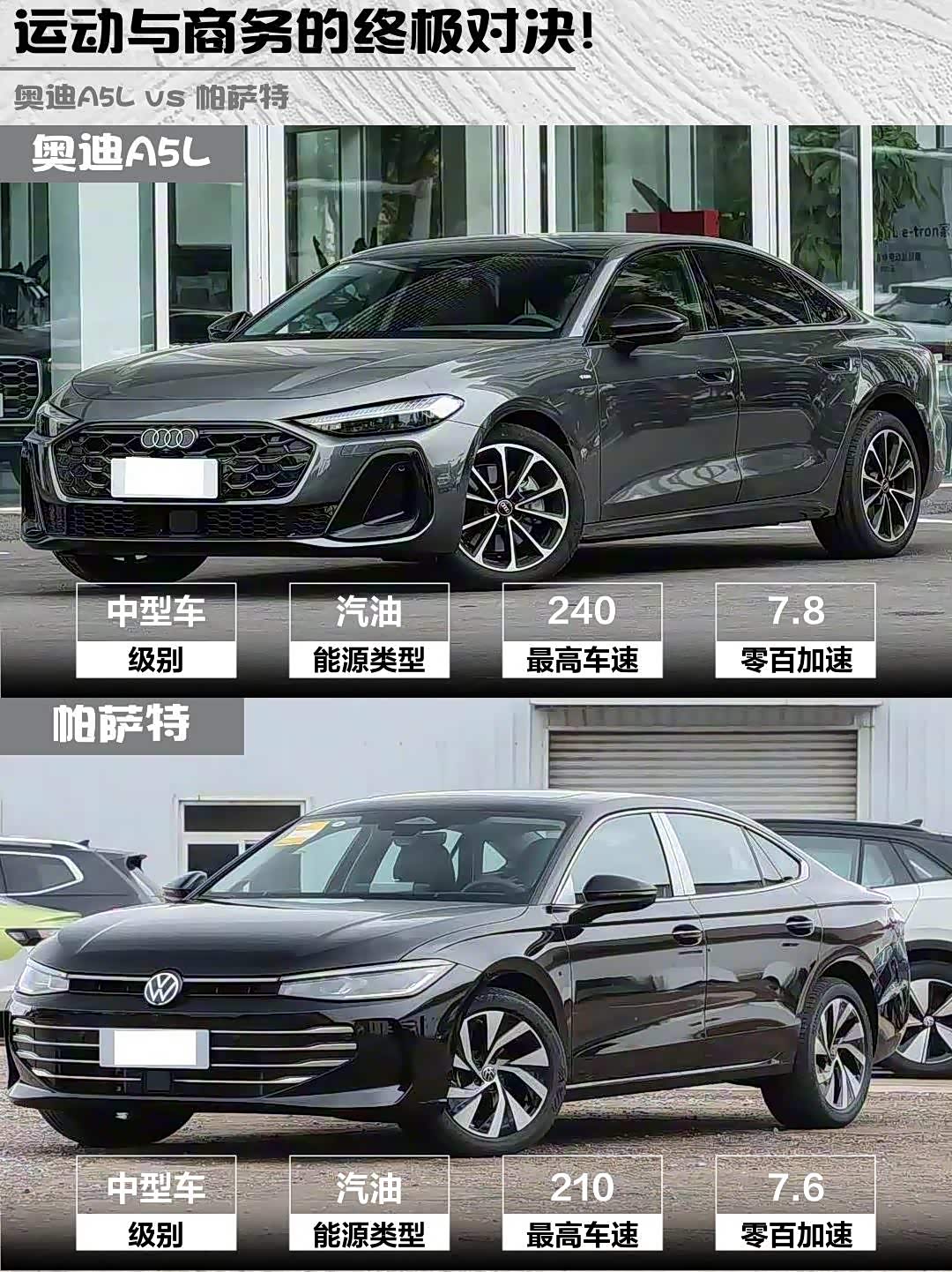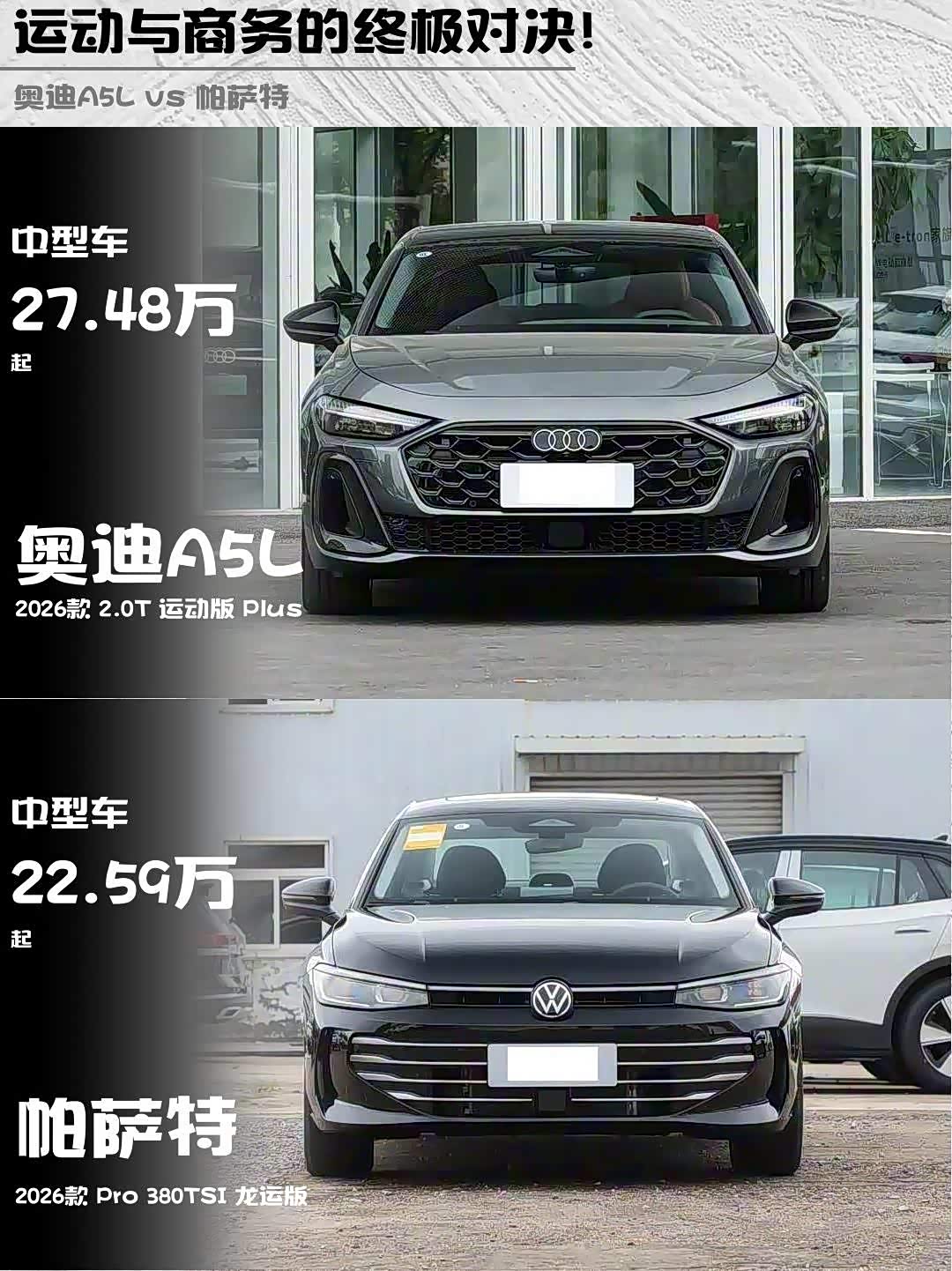 最近在选车的小伙伴看过来!奥迪A5L 2026款 2.0T 运动版 Plus和 帕萨特(参数|询价)2026款 Pro 380TSI 龙运版双车对比,看完这篇你就知道怎么选了!🔥