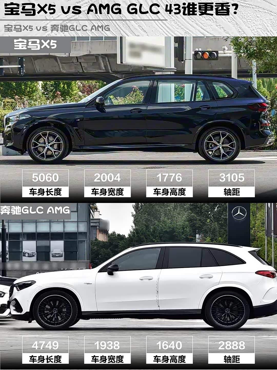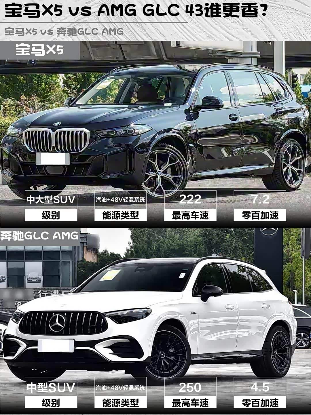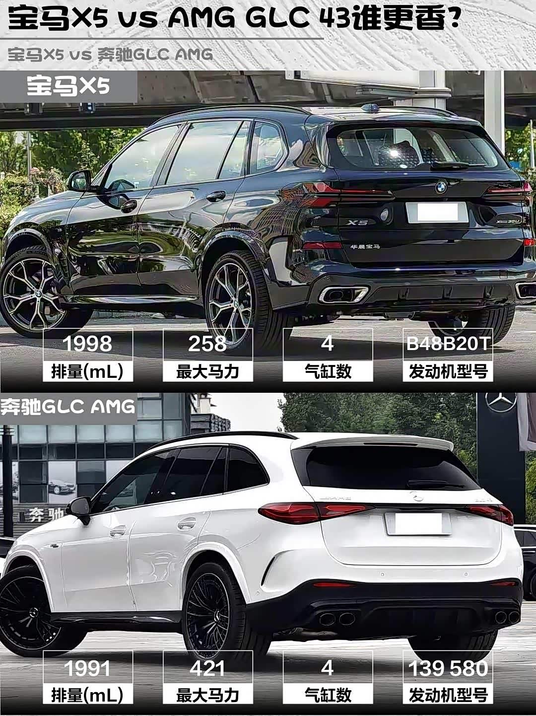 AMG GLC 43的2.0T+48V轻混能爆出421马力,4.5秒破百的加速直接让宝马X5的7.2秒(2.0T 258马力)吃灰!但X5的采埃孚8AT低速更丝滑,AMG的9AT低速顿挫被吐槽不少。实测AMG运动+模式放炮声浪超上头,X5则胜在48V轻混启停几乎无感。要暴躁选AMG,要平顺选X5!