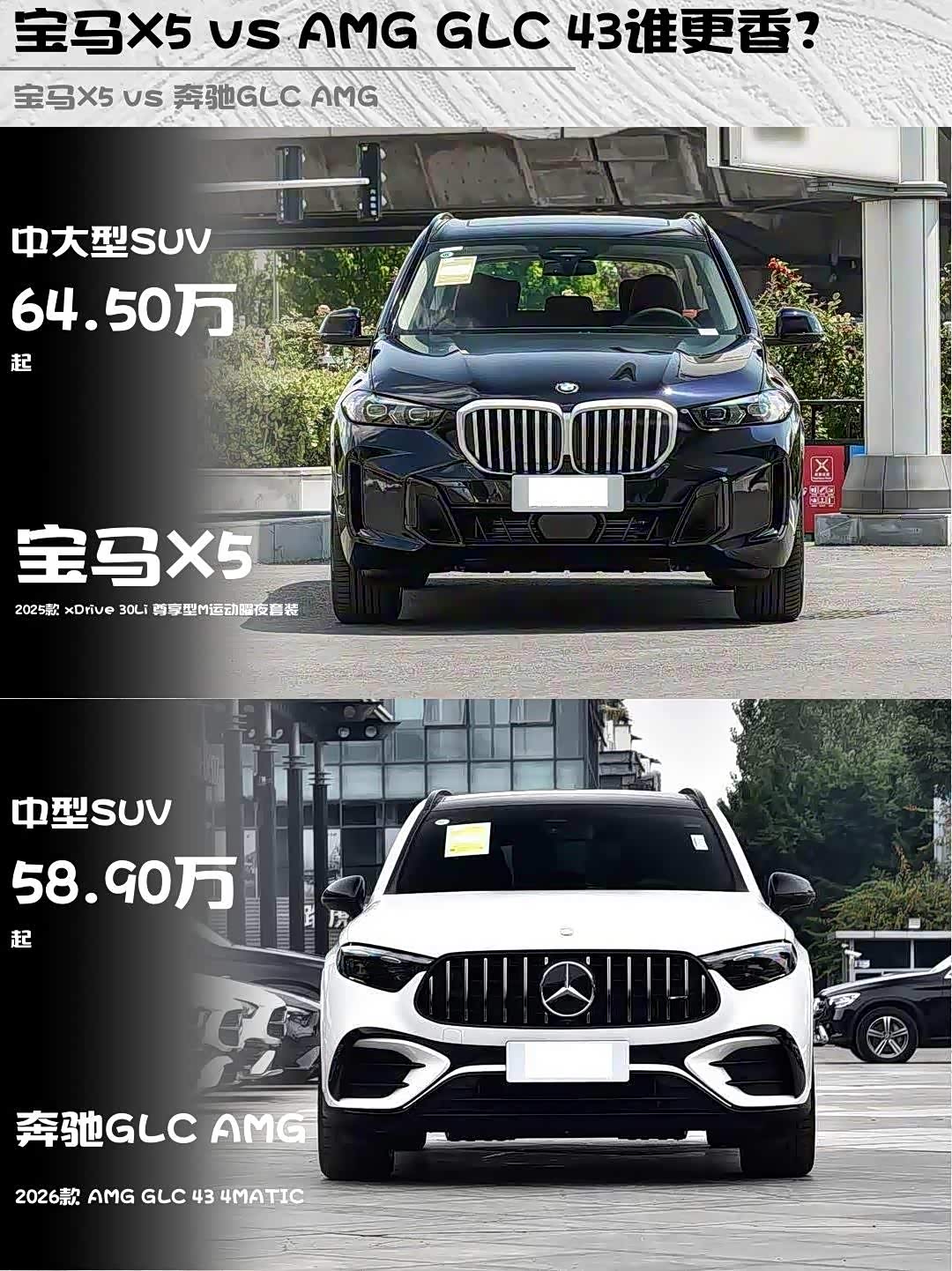 最近后台好多兄弟在问:60万预算,宝马X5和 奔驰GLC AMG(参数|询价)到底怎么选?🤔 今天直接拿2025款宝马X5 xDrive 30Li尊享型M曜夜套装(64.5万)和2026款AMG GLC 43 4MATIC(58.9万)硬核对比,看完保你不再纠结!