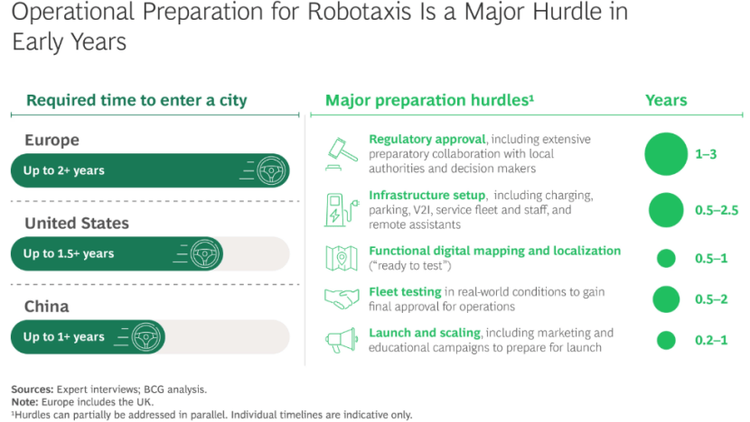 BCG指出,2035年将成为Robotaxi规模化关键节点,中美将成为全球核心市场,欧洲因监管和成本问题进展缓慢,潜力与不确定性并存。