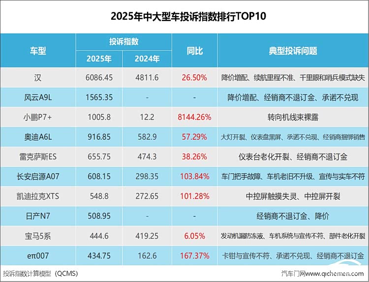 数据显示:2025年度中大型车投诉指数达到了17461.3,同比上涨了68%。从投诉榜单来看,前十名中大型车的投诉指数悉数出现了同比上涨。这其中, 小鹏P7(参数|询价)+的投诉指数同比涨超81倍,空降榜单第三名。长安启源A07、凯迪拉克XTS、eπ007的投诉指数亦有明显涨幅,翻了一倍有余。值得一提的是,去年上市的两款新车风云A9L和日产N7也登上了投诉榜单,分列榜单第二、八名。