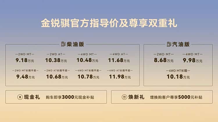 作为新时代实干家的量身之作,金锐骐以三大核心实力重塑创富皮卡价值标杆。经济性上,其搭载日产雷诺M9T柴油发动机与8AT变速箱黄金组合,108kW强劲动力满足多元工况需求,2000BAR超高压燃油喷射系统实现极致省油,百公里6.8L综合油耗换算下来每公里成本仅0.4元,大幅降低长期运营负担。