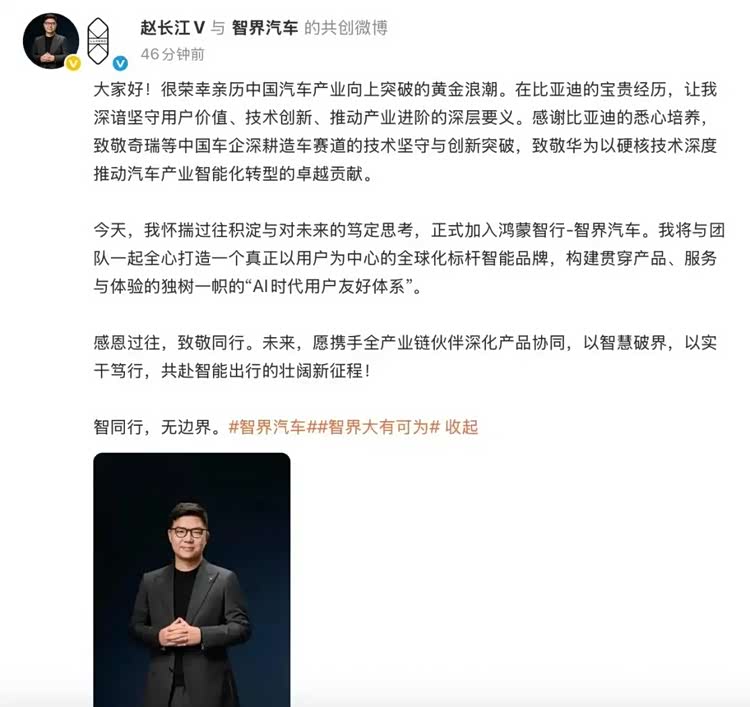 挥别比亚迪83天后,赵长江官宣了他的新职务。如传闻中所预料的一般,他成了“鸿蒙五界”的又一位主理人——智界品牌的实际掌舵者,官方职务为奇瑞集团销售常务副总经理,智界汽车执行董事及执行副总裁。赵长江的到来,有望补齐智界品牌的营销短板。