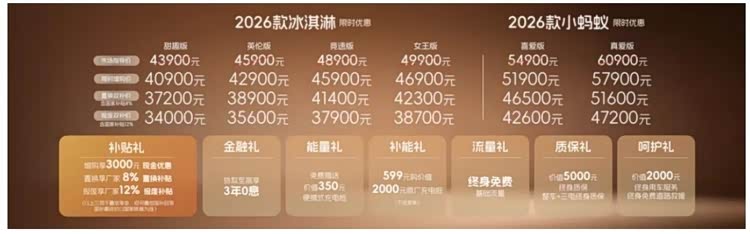 1 月 10 日晚间,奇瑞汽车于安徽芜湖凤鸣研创中心圆满举办 “潮有料开麦夜” 暨 2026 款全新冰淇淋上市发布活动。在脱口秀演员 Echo 与其好友带来的趣味互动分享中,26 款全新奇瑞冰淇淋正式登陆市场,以 “两门高定出行潮品” 的鲜明定位,为微型纯电市场注入新活力。新车共推出四大版本,甜趣版 34000 元起售、英伦版 35600 元起售、竞速版 37900 元起售、女王版 38700 元起售。同步亮相的全新 小蚂蚁(参数|询价),新增 271km 喜爱版与 271km 真爱版两款车型,续航里程由 251km 提升至 271km,其中喜爱版售价 42600 元起,真爱版售价 47200 元起,进一步完善了奇瑞新能源在微型纯电领域的产品布局。