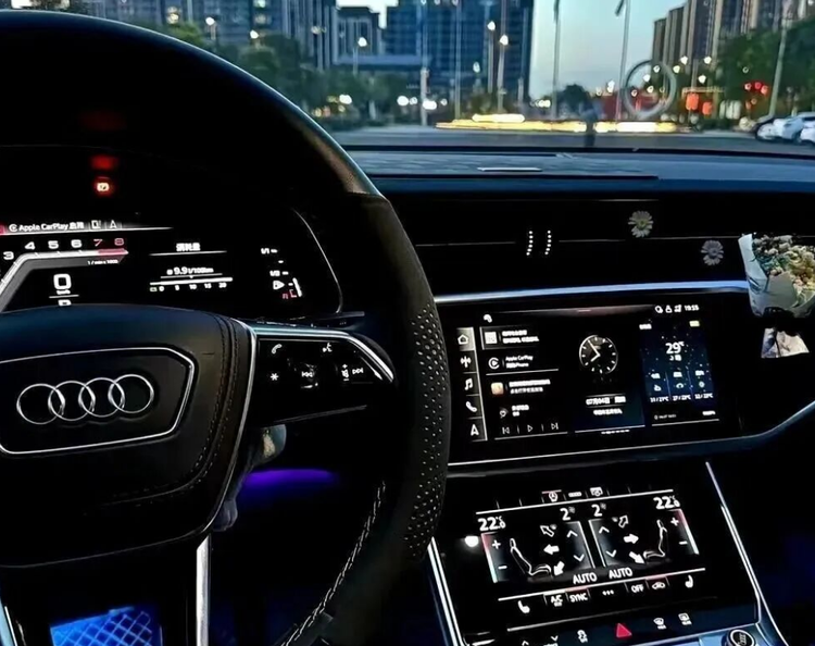 先说外观,前脸设计很激进。矩阵式LED大灯变得狭长,灯腔层次感强。大嘴格栅采用熏黑蜂窝设计,奥迪四环logo变扁,有点新A7的味道。侧面溜背线条流畅,隐藏式门把手视觉上干净,还带来科技感。底盘降低约15mm,看起来更趴,上下地库得留意。20寸花瓣轮毂视觉冲击强,比商务范五辐轮毂帅多了。