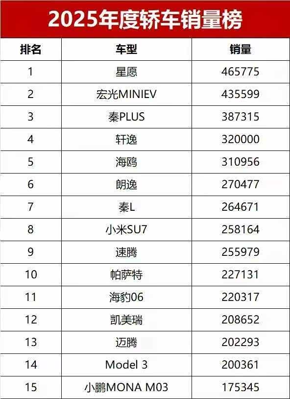 放眼2025年的中国轿车市场,是一场新旧力量激烈碰撞的格局。根据行业权威数据,从年度销量前十的轿车车型名单来看,以比亚迪、吉利为代表的中国品牌,凭借新能源技术的全面领先,以前所未有的密集阵型占领高地,而以日产、大众等传统合资巨头组成的阵营依靠深厚的品牌积淀和产品韧性,在变局中固守了核心市场,接下来我们就来看看前十名车型的销量表现。