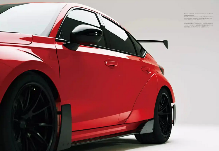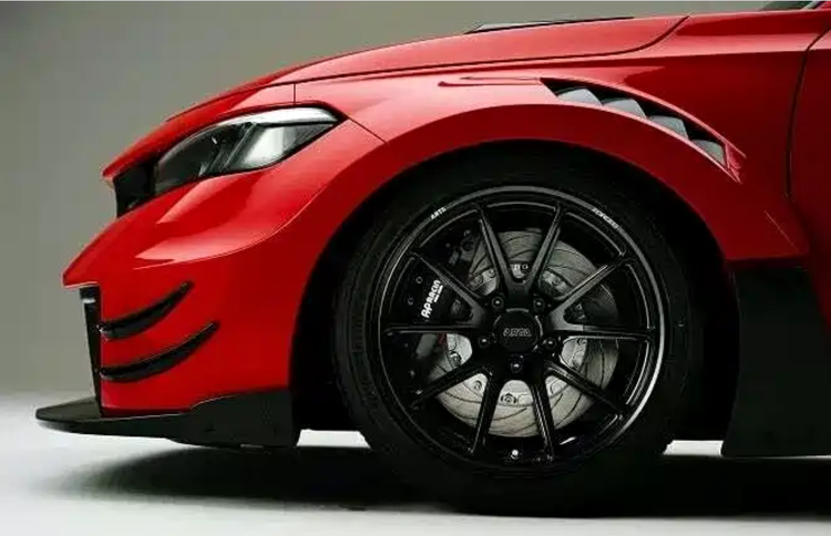 车身侧面最直观的变化来自宽体轮眉的加入,但这一结构并不单纯为视觉服务,而是为更宽规格轮胎与更大制动系统预留空间。从轮眉后部可以看到独立通风口设计,其主要作用是释放轮腔内高压气流,减少乱流对车身侧面的干扰。侧裙扰流板与前后空气动力学组件形成协同作用,对侧向气流进行梳理,在高速并线或连续变向时,有助于车身姿态保持稳定。对于前驱高性能车型而言,这种侧向气流管理对操控一致性有直接影响。