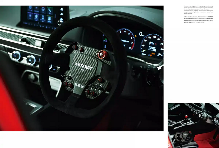 进入车内,ARTA GT套件并未对内饰进行大幅度拆减,空调系统与娱乐系统仍然保留,这意味着车辆在法规与基本使用层面仍具备一定完整性。主要变化集中在方向盘部分,车辆换装快拆式赛车方向盘,并采用Alcantara材质包覆。方向盘按键布局围绕驾驶相关功能重新设定,减少无关操作干扰。这种调整对于佩戴赛车手套驾驶、快速转向操作具有实际意义。
