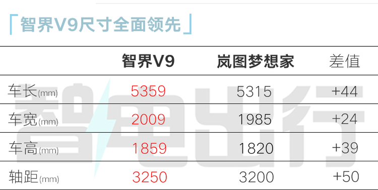 对比同样搭载华为乾崑智驾的岚图梦想家,两者均定位中大型新能源MPV。智界V9在尺寸上全面占优,但智界V9的电池比岚图梦想家略小,续航上有劣势。