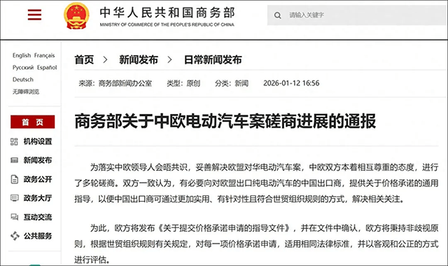 中国商务部1月12日通报,中欧双方达成共识,以“价格承诺机制”替代原定最高35.3%的高额反补贴关税,欧盟将发布统一指导文件,对所有中国车企一视同仁。这股和解之风也涵盖到了光伏等新能源领域。