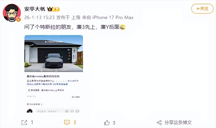 随即有行业人士透露,廉价版Model 3/Y确定将在国内市场发售,而且是先更新Model 3车系,然后再是Model Y。