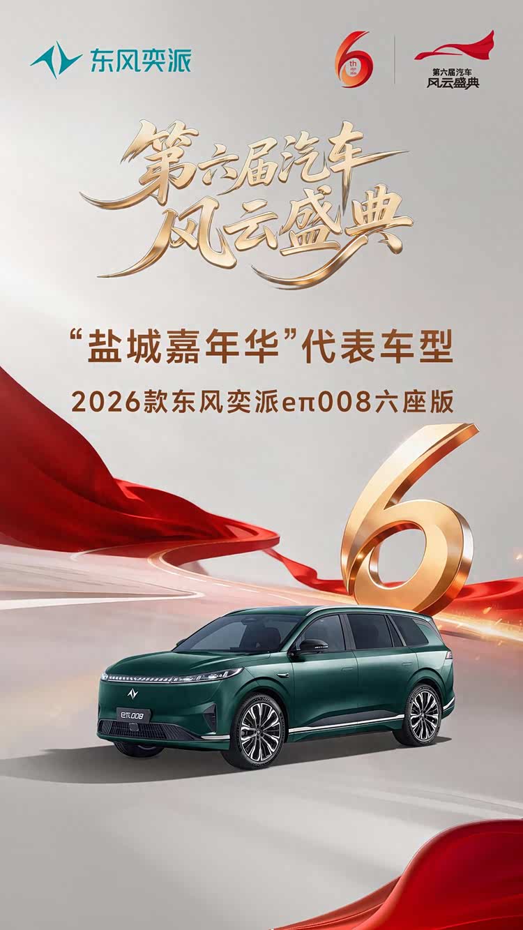 车家号·0浏览·2026-01-14 14:56 · 安徽第六届《汽车风云盛典》入选车型名单新鲜出炉,2026款东风奕派eπ008六座版成功入选“第六届《汽车风云盛典》‘盐城嘉年华’代表车型”。这款专为家庭出行打造的“大舒适家”,此次斩获权威荣誉,既是市场与专业机构对其产品力的认可,也为中国家庭提供了更优质的新能源出行选择,展现东风奕派的技术实力与品牌温度。