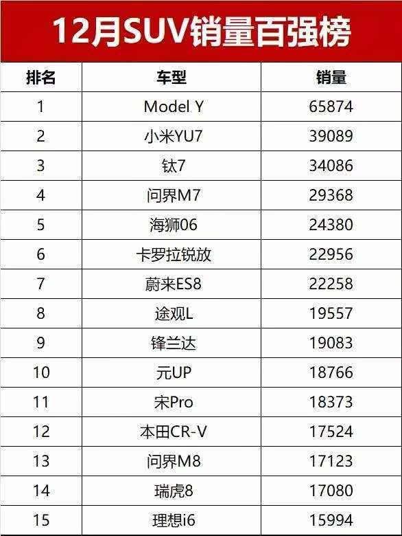2025年12月国内车市未能迎来预期中的完美收尾,乘联会数据显示,当月狭义乘用车市场零售销量同比下降14.0%,达到226.1万辆。在此背景下,SUV市场依然展现出较强的消费吸引力,117.8万辆的销量占据半壁江山,尽管同比下跌12.6%,但环比仍实现4.1%的增长。从销量前十榜单来看,新能源车型持续霸榜占据七席,传统燃油车则凭借可靠品质与性价比坚守剩余阵地,接下来我们就来看看前十名SUV的表现吧。