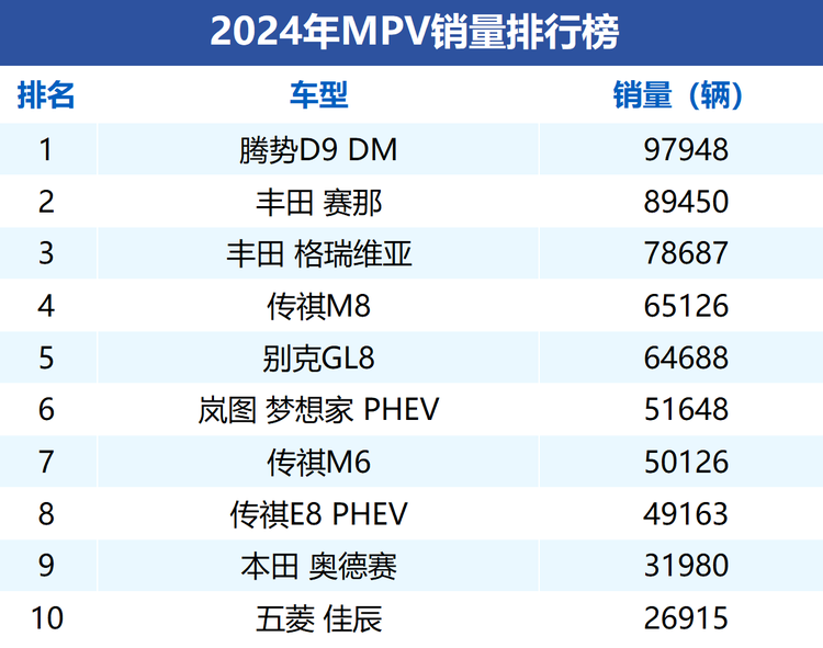 复盘2024年榜单不难发现,2025年的MPV市场完成了一次彻底的“新旧交替”大洗牌,面对激烈的淘汰赛,多款老面孔遗憾离场,而又有多款新势力产品强势补位。随着越来越多具备硬核实力的产品涌入赛道,今后的MPV市场版图注定会被再次改写。