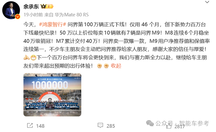 问界第一个100万用了五年,第二个100万力争在两年内完成。
