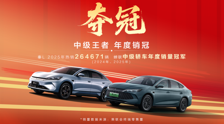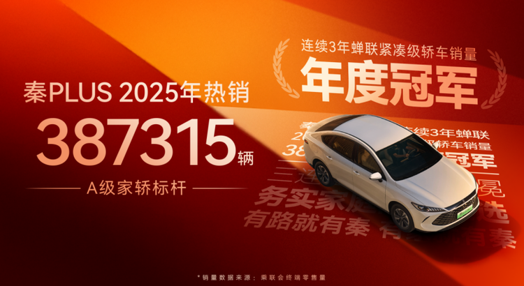 乘联会2025年度销量榜单的发布,让秦家族成为家轿市场的绝对焦点: 秦PLUS(参数|询价)以387,315 辆的成绩登顶紧凑级轿车年度冠军,连续三年蝉联该荣誉;秦L 则以 264,671辆的销量问鼎中级轿车市场冠军,实现两年连冠。双细分市场的统治级表现,彰显了秦家族在产品力与用户口碑上的深厚积淀。