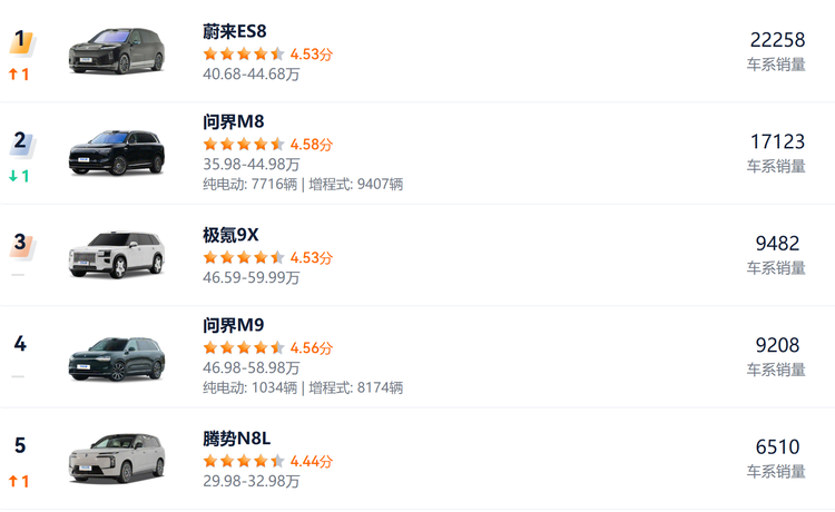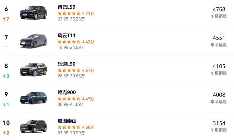 排名第四的问界M9,已经是一款很成熟的产品了,销量表现也很稳健。榜单中涌现的多个“新晋黑马”的表现,或许会更值得关注。包括腾势N8L、智己LS9、风云T11、岚图泰山,均是近几个月上市的新车。