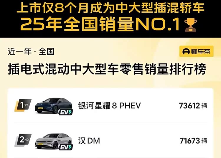 上市仅八个月,累计热销73612辆,吉利银河星耀8以无可争议的市场表现,荣膺2025年中大型插混轿车销量冠军。这一耀眼成绩,绝非偶然,而是其凭借“豪华设计、豪华电混、豪华座舱、豪华安全、豪华科技”五大颠覆性产品力,对传统中大型轿车市场进行价值重构的必然结果。作为全球新一代豪华中大型电混轿车,星耀8已从一众强手中脱颖而出,成为消费者心中名副其实的“冠军之选”。