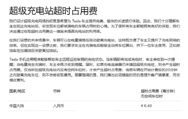 1、仅在超级充电站内没有空闲车位时,才会产生超时占用费,每分钟还是6.4元。