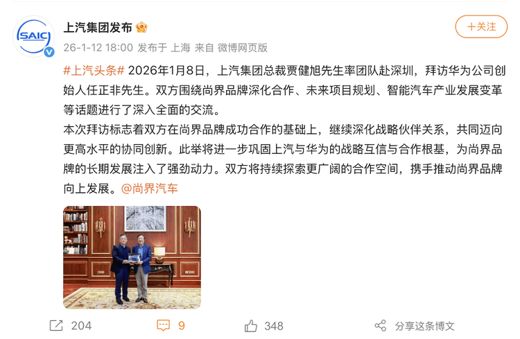 车东西1月13日消息,日前,上汽集团宣布,2026年1月8日,上汽集团总裁贾健旭亲自带队奔赴深圳,拜访了华为公司创始人任正非。