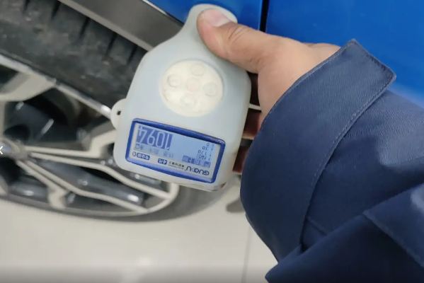 在验车的这一天,我先是绕着车辆去仔细地观察外观。蓝色的车身主体整体的油漆面光泽度很不错,没有明显的划痕和色差。当我检查到右后翼子板时,就发现有一些问题,我用手轻轻的触摸翼子板的边缘,感觉手感并不是很顺滑,有轻微的颗粒感。当我在凑近观察时,就能看到油漆面的反光度和原车漆之间有一些细微的差别,仔细对比之后确认,这里曾经做过喷漆修复。接着我又仔细的检查右后翼子板的钣金情况,用手按压表面,感觉到局部的硬度和周围有一些不一致。所以这就说明这里做过钣金修复。