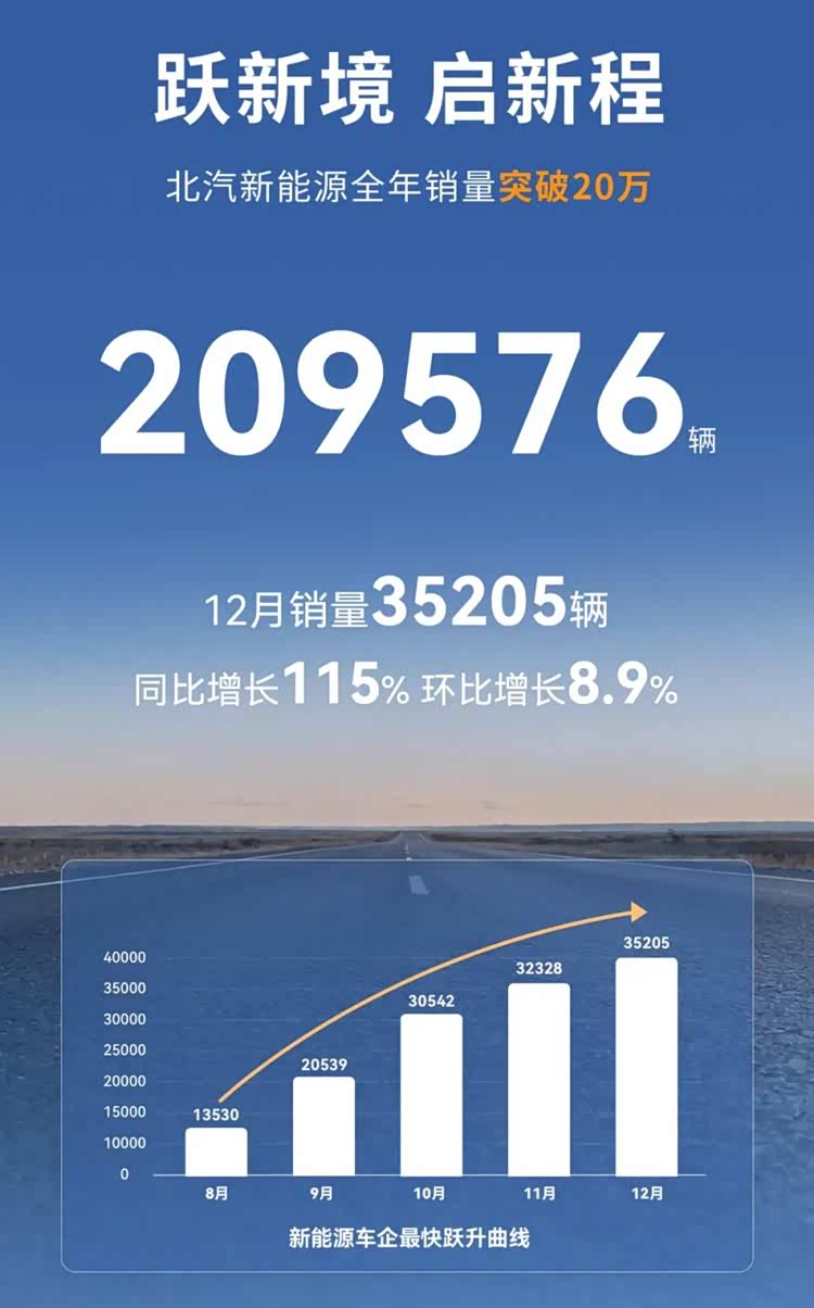 2025年,北汽新能源全年销量一举突破20万辆大关,达到209576辆,同比增幅高达 84%。其中12月单月销量再攀新高,以35205辆的成绩创下同比115%的增长,更实现连续三个月销量突破3万辆,展现出强劲且稳定的增长韧性。
