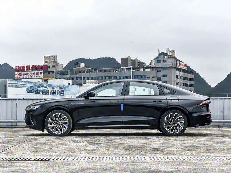 再来看车身侧面部分,车身尺寸达4982×1865×1485mm,2930mm轴距较宝马3系长近80mm,奠定舒展的中型车姿态。侧面以溜背美学为核心,车顶线条从B柱缓缓下沉至车尾形成小鸭尾,既保留头部空间,又将风阻系数压低。19英寸亮黑镀铬双色多幅轮毂搭配235/40 R19宽胎,视觉冲击力拉满且提升抓地力。隐藏式电动门把手与车门下方镀铬饰条呼应,营造“长轴距短前悬”的豪华感,同时避免了传统门把手的突兀。