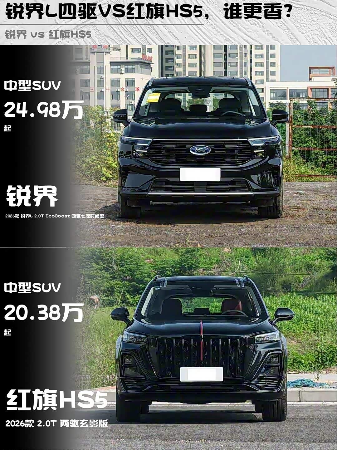最近后台好多人在问25万预算买中型SUV,到底选美系老将2026款锐界L 2.0T四驱七座时尚型(24.98万)还是国产豪华2026款 红旗HS5(参数|询价) 2.0T两驱玄影版(20.38万)?今天直接上干货对比!🔥