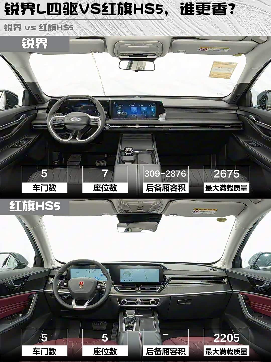 坐进红旗HS5瞬间被征服——玄影版红黑内饰+253色氛围灯+Nappa真皮,门把手还有旗标投影仪式感拉满!🎇 锐界L全黑内饰确实单调,但美系车的粗犷做工更耐造,翻毛皮座椅冬天不冰屁股。