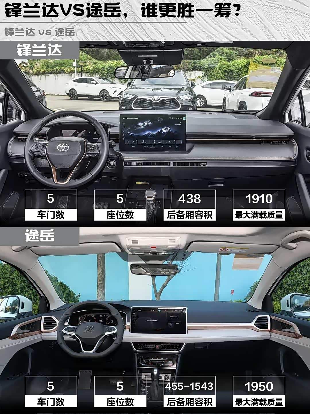 途岳后备箱455L确实能装,后排腿部多2指空间。但锋兰达座椅更符合人体工学,开长途不腰疼👏。两车全景天窗采光都好,锋兰达电动尾门是标配(途岳要选装),搬东西更方便。