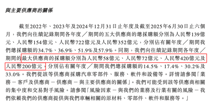 自2022年至2025年上半年,问界累计生产约65万辆车,同期赛力斯向最大供应商支付的零部件、软件及渠道相关费用合计约750亿元,若以2025年整体销量推算,赛力斯向最大供应商支付采购费用已经超过千亿。虽然没有明确标注供应商是谁,但从提供服务范围、合作内容和起始日期都足以明确指向华为。