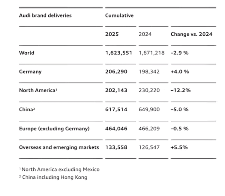 1月14日,奥迪汽车发布2025年全球交付数据,全年累计交付162万辆汽车,同比下滑2.9%,未能实现165万至175万辆的年度目标。这一业绩背后,是奥迪在全球不同市场面临的截然不同的境遇,中国市场销量同比下滑5%,北美市场更是大幅下降12.2%,成为拖累整体表现的主要因素。