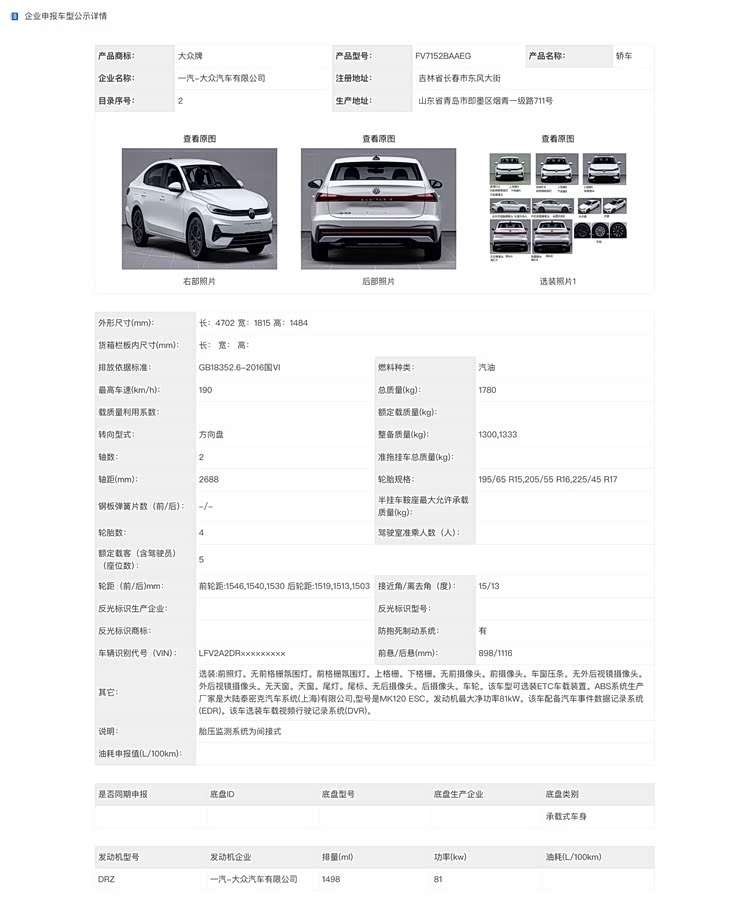 新车尺寸是长4702mm、宽1815mm、高1484mm,轴距2688mm,车长和轴距比速腾L短一点。侧面造型也与速腾L类似,即速腾S采用传统机械门把手设计。
