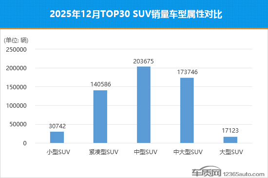 本月,中大型SUV销量再度刷新近一年最高历史纪录,环比大涨66.5%。同期,小型SUV和中型SUV市场同样热度攀升,销量分别较11月上涨49%和15%。与之形成鲜明对比的是,紧凑型SUV市场表现疲软,销量环比下滑28.9%,已降至年内最低点。